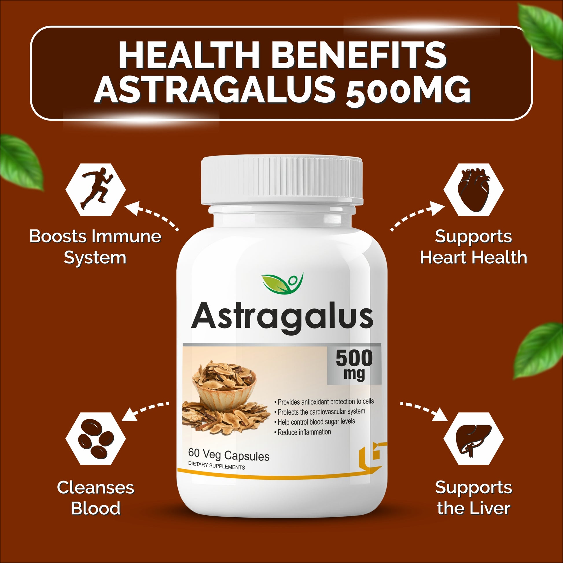 Supports cardiovascular health: Astragalus has been traditionally used to support heart health. It may help improve blood circulation, lower blood pressure, and reduce inflammation in the arteries. Some studies suggest that it can protect against heart damage and improve cardiac function.
