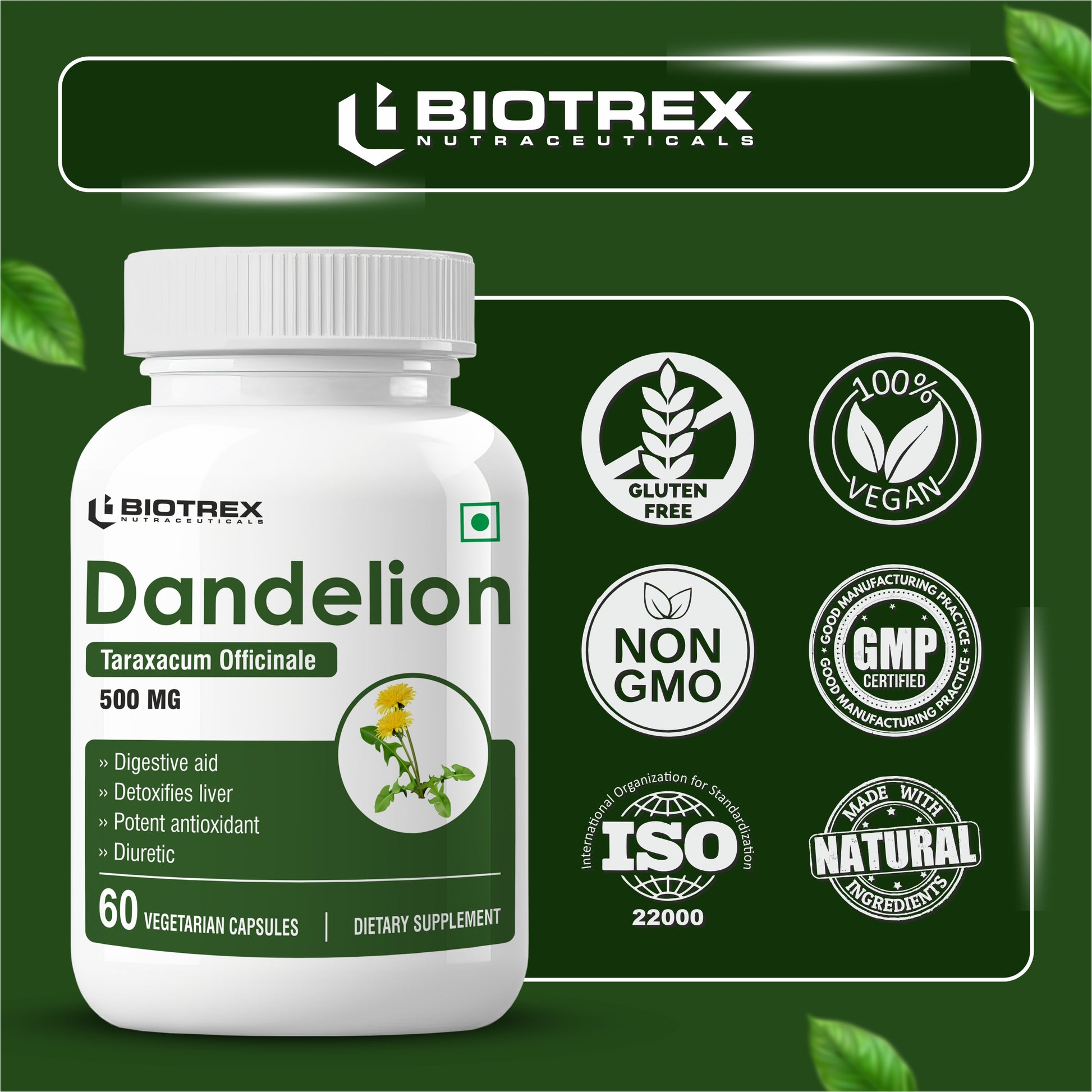 Biotrex Dandelion 500mg - 60 Capsules, Antioxidant, Detoxifies Liver, Digestive Aid