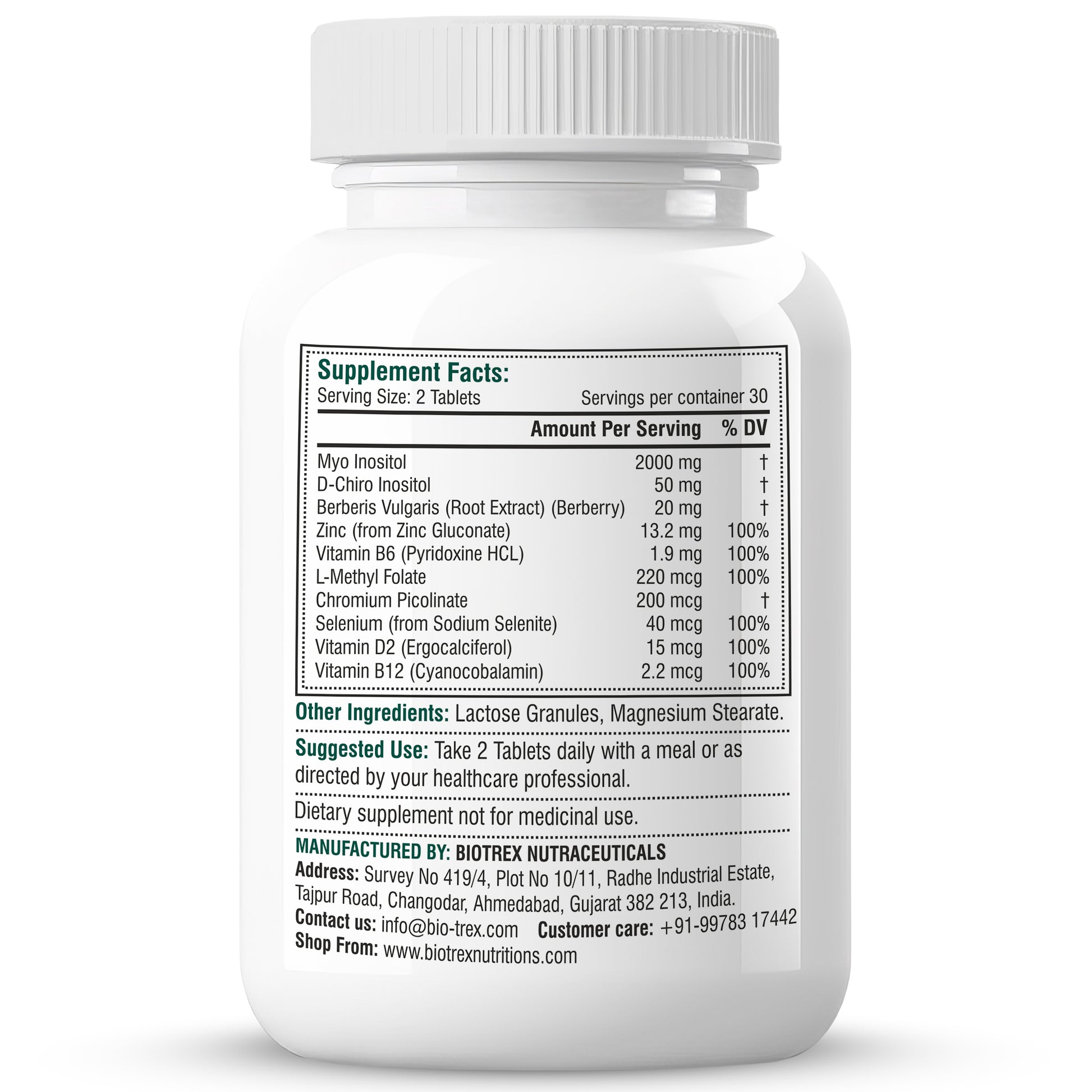 - Ingredients : Our Biotrex Nutraceuticals PCOS Balance Supplement contains Myo Inositol, D-Chiro-Inositol, Berberine (Berberis Vulgaris), Zinc, Vitamin B6, L-methyl Folate, Chromium Picolinate, Selenium, Vitamin D2, Vitamin B12.