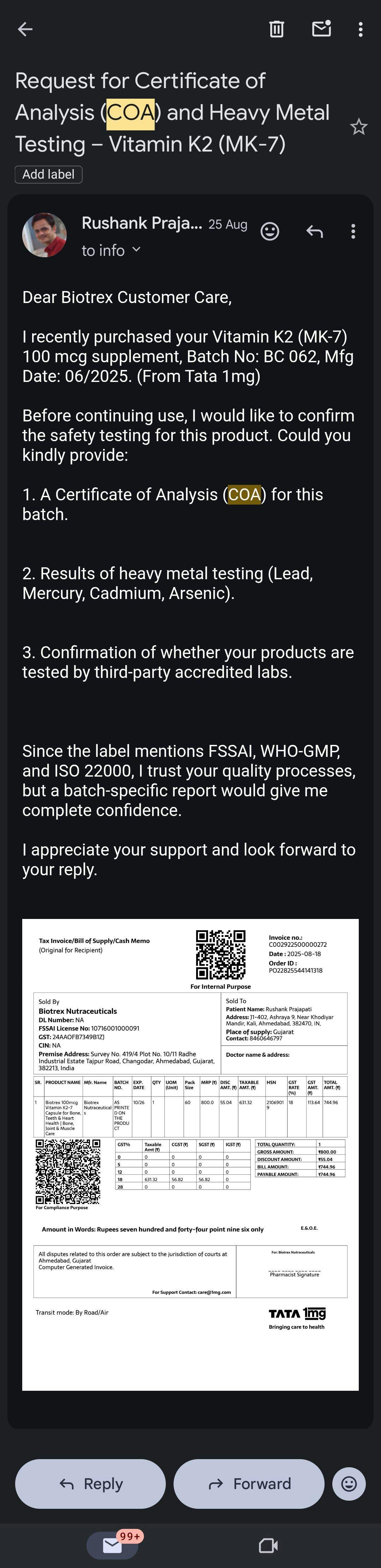 Biotrex Vitamin K2-7 100mcg - 60 Capsules Bone Health, Dental health support & Cardiovascular health benefits